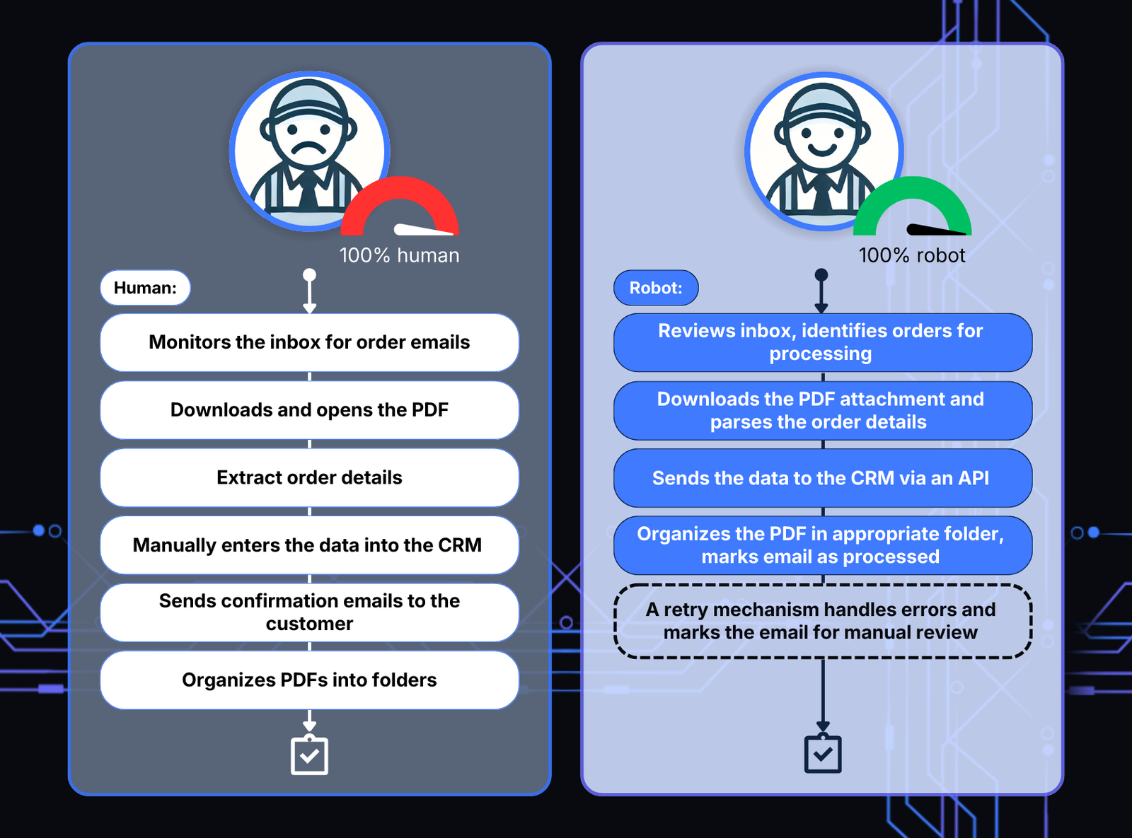 Instead of requiring an employee to manually enter data, the robot processes the order details and sends them directly to the CRM, ensuring accuracy and eliminating delays. Once processed, the system organizes the PDF in the appropriate folder and marks the email as completed, maintaining a structured workflow.