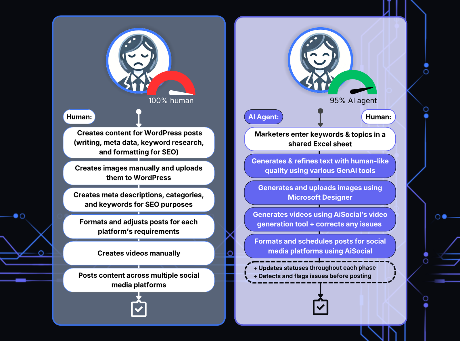 Our team developed an AI agent utilizing UiPath. It continuously monitors a centralized Excel sheet where marketers enter essential details such as keywords, topics, and content parameters. Once new data appears, the agent automatically generates text and metadata using generative AI tools, such as OpenAI, Gemini, Claude, and Copilot. Then, the AI agent refines it via Writer.com and an AI “humanizer” to maintain an engaging, authentic tone. This ensures SEO-optimized, non-duplicative posts.